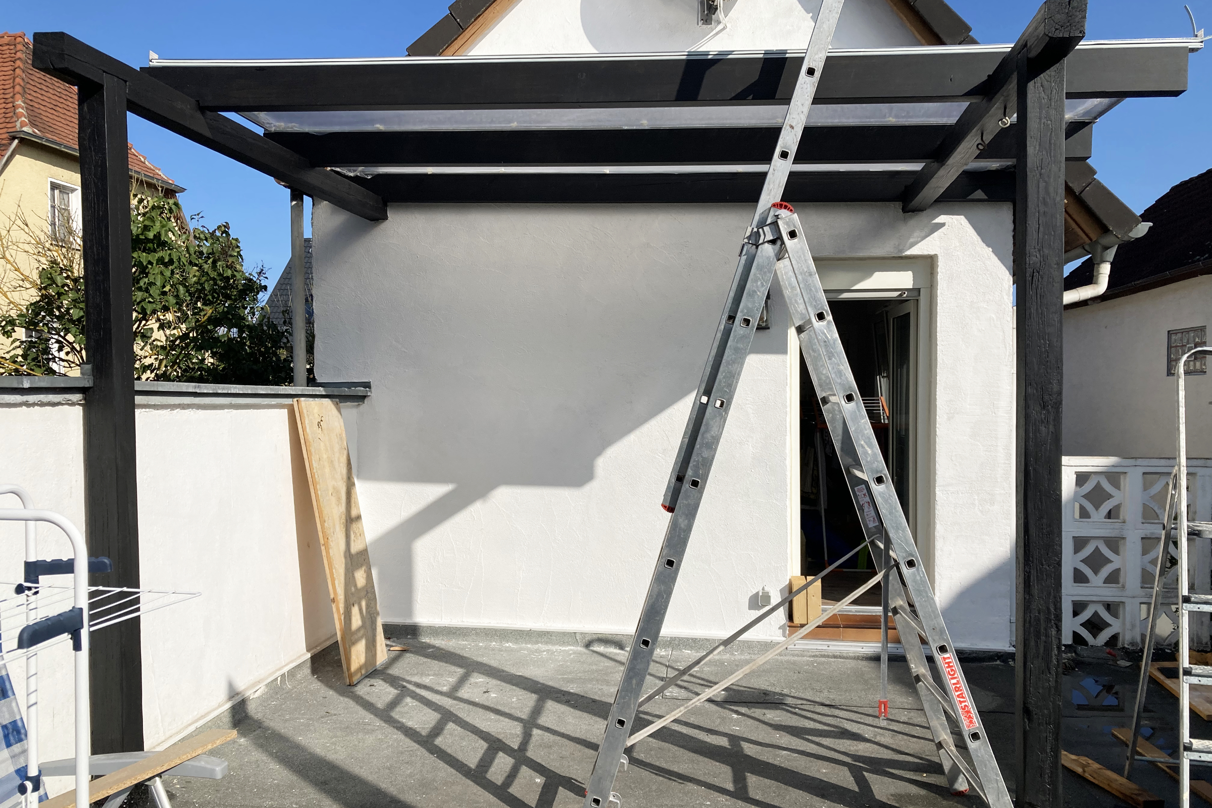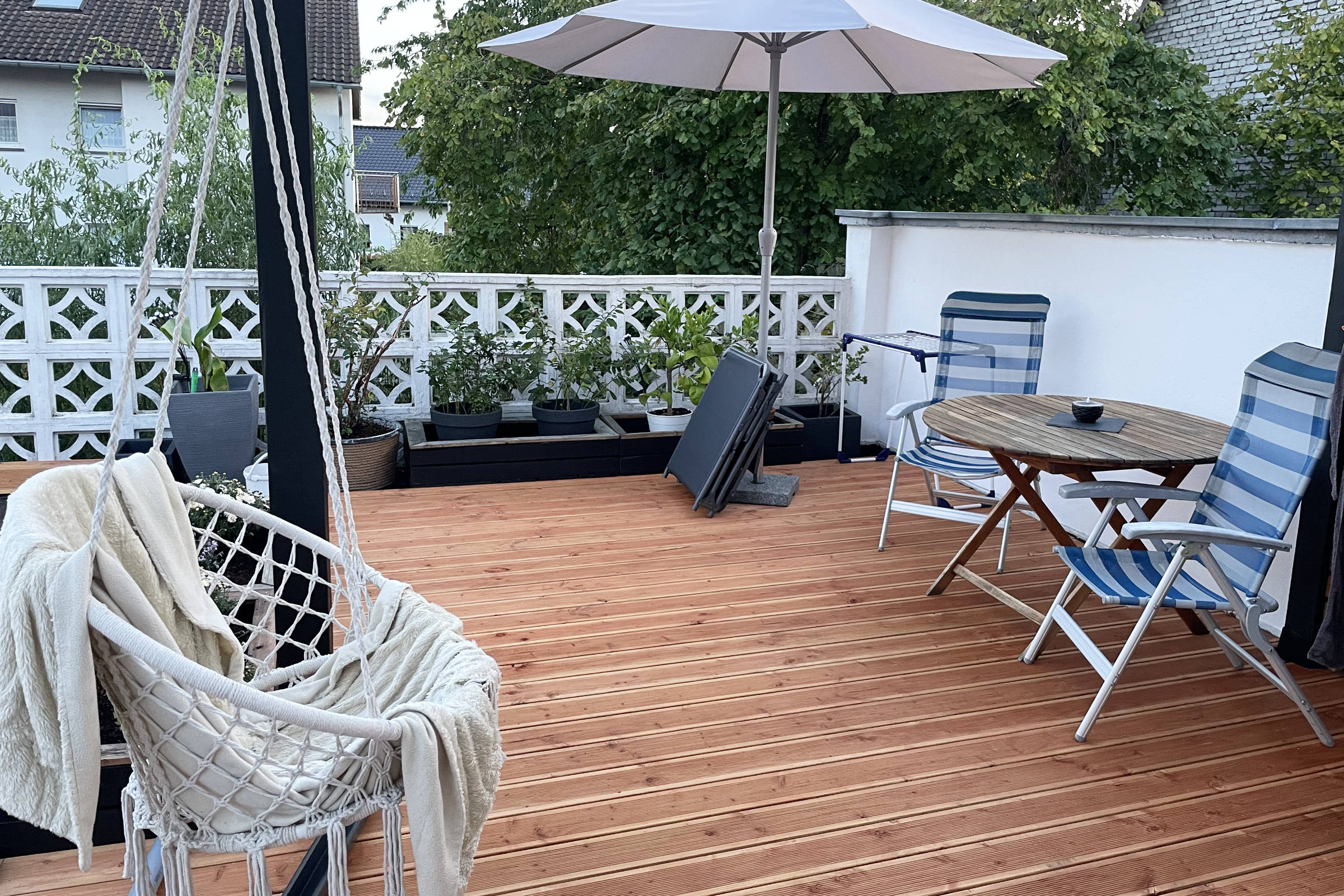 Neben dieser kleinen Lounge gibt es noch ein weiteres, deutlich größeres Projekt: die Dachterrasse direkt am Haus. Hier ist bereits viel passiert. Die alte, in die Jahre gekommene Überdachung mit morschen Balken und Wellplatten wurde komplett erneuert und durch moderne Doppelstegplatten ersetzt. Damit ist nicht nur die Optik, sondern auch die Substanz deutlich aufgewertet worden.Ein besonderer Fokus liegt hier auf Holz – meinem absoluten Lieblingsmaterial. So entstand eine ca. 20 m² große Terrassendiele aus Douglasie, die dem gesamten Bereich Wärme und Natürlichkeit verleiht. Auch eine gebrauchte Teakholz-Garnitur hat hier ihren Platz gefunden. Diese wird aktuell noch geschliffen und neu geölt, um wieder in neuem Glanz zu erstrahlen. Ein weiteres Highlight ist der Makramee-Hängesessel, der dem Bereich eine entspannte, fast schon boho-inspirierte Atmosphäre gibt. Dazu kommen viele Pflanzen und vorbereitete Hochbeete, die den Raum lebendig machen und Struktur geben. Der Stil bewegt sich insgesamt zwischen Industrial und Boho – eine Mischung aus klaren Linien, natürlichen Materialien und gemütlicher Leichtigkeit.